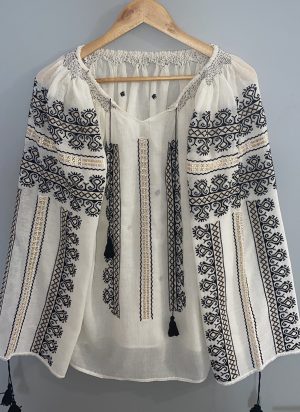 Ie tradionala romaneasca, lucrata exclusiv manual, cu fir de bumbac de culoare(rosu si negru) si mătase alba, pe panza topita din bumbac 100 %, de culoare albă.
