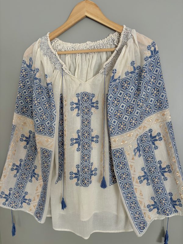 Ie românească cu mânecă lungă, brodată manual pe panză crem din bumbac 100%, subțire, vaporos și ușor transparent.