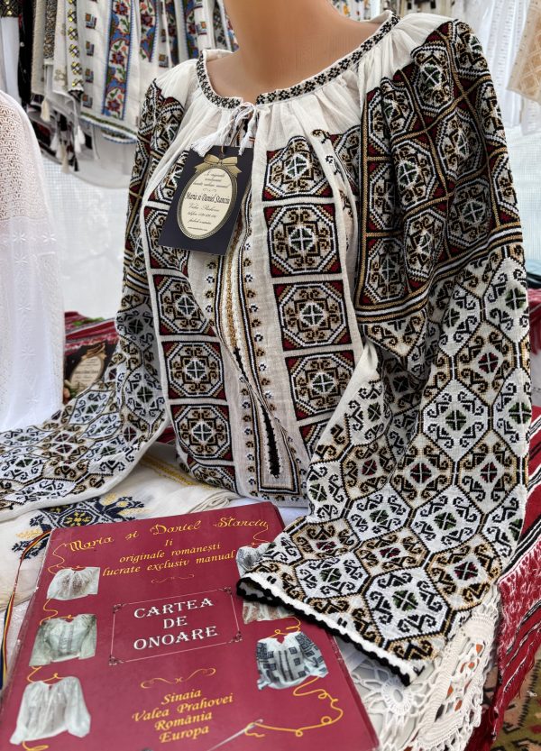 - Ie românească cu mânecă lungă, brodată manual pe panză albă din bumbac 100%, subțire, vaporos și ușor transparent.