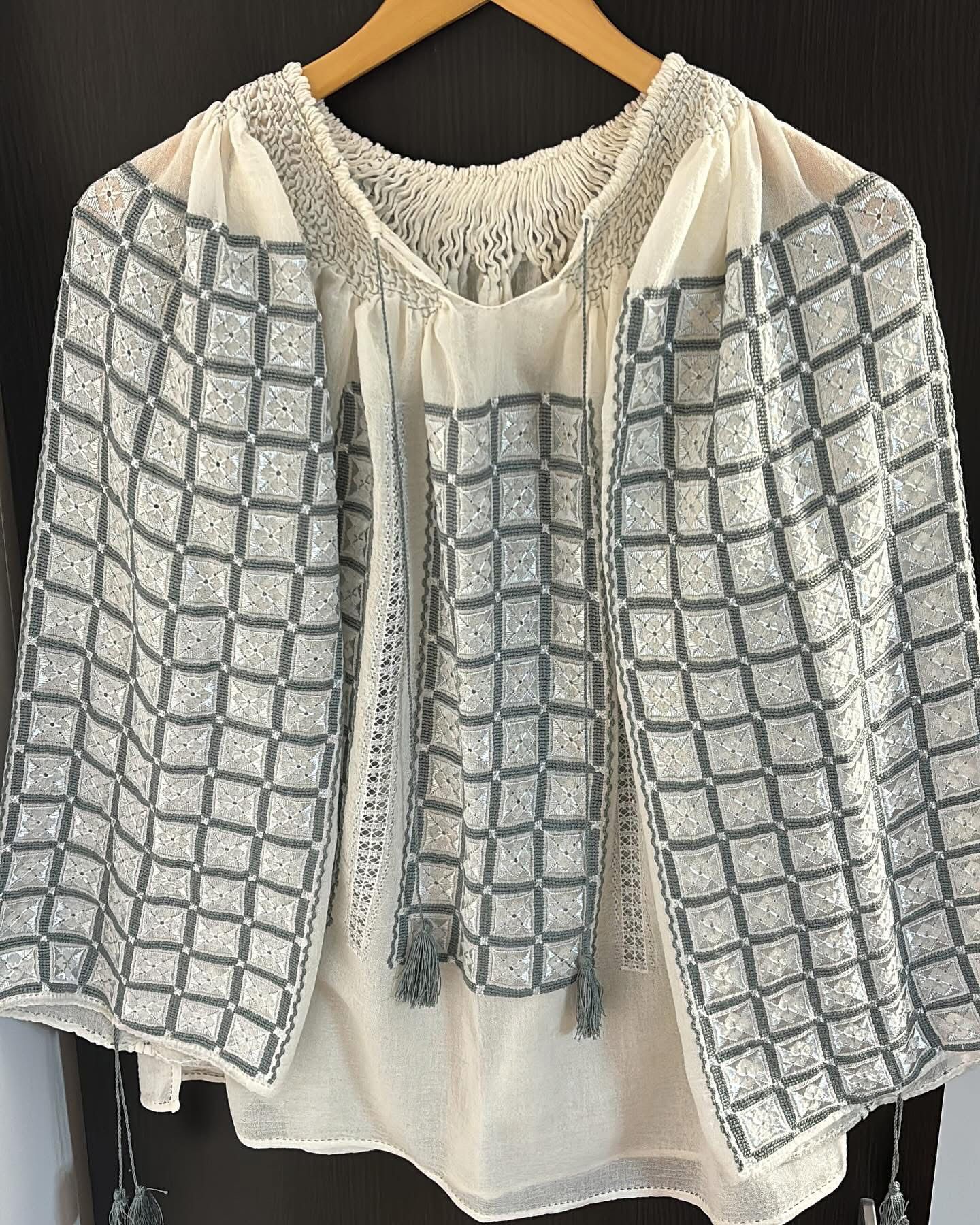 Ie românească cu mânecă lungă, brodată manual pe panză crem din bumbac 100%, subțire, vaporos și ușor transparent.
