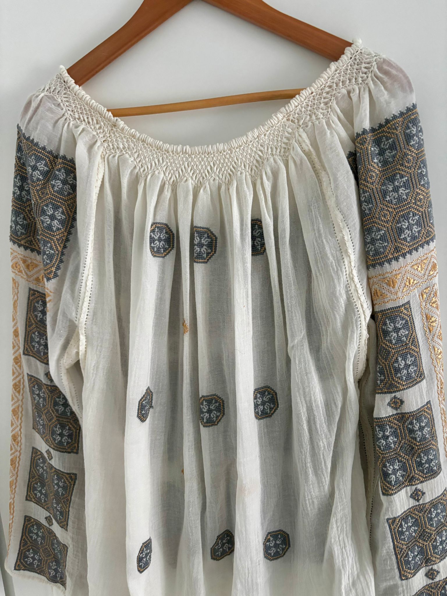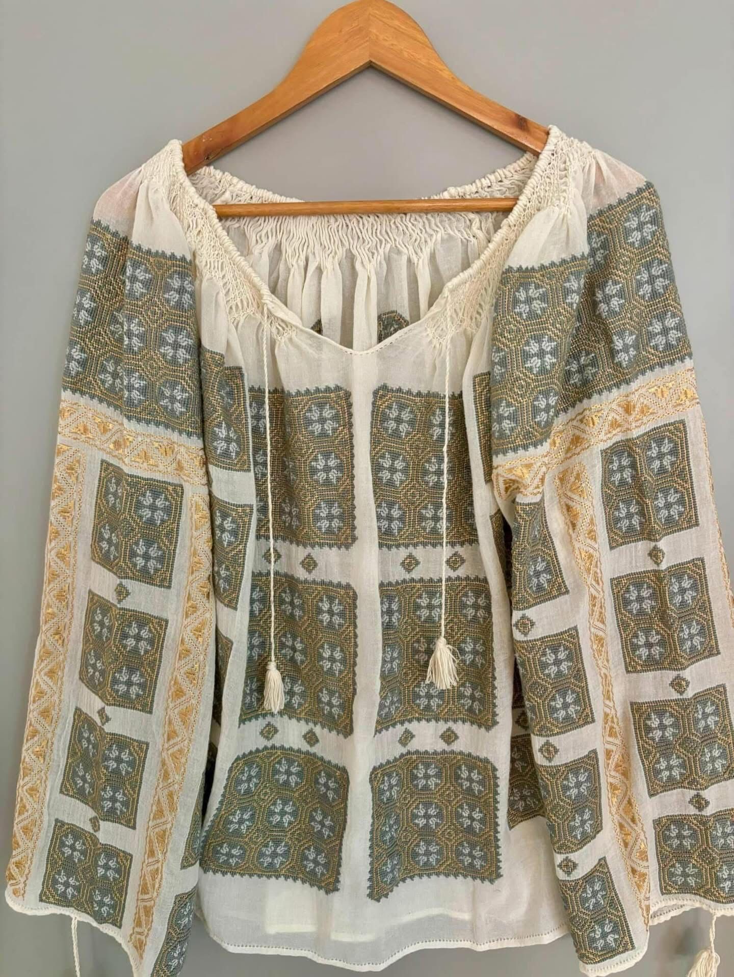 Ie românească cu mânecă lungă, brodată manual pe panză crem din bumbac 100%, subțire, vaporos și ușor transparent.